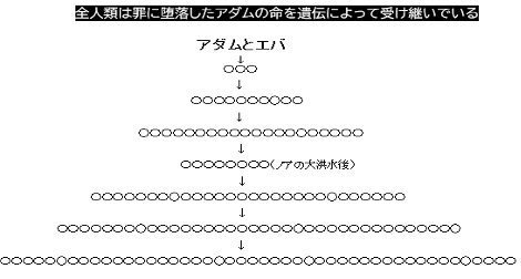 パウロは、アダムの遺伝によって生まれて来た全人類を、「アダムにある者」、つまり、「アダムの内に包含されている者」と理解をしていました。図で分かるように、全人類は全部共通して罪に堕落したアダムの命を遺伝によって持っています。その一人一人のアダムの命は、遡って行けば神がアダムの命の中に包含されていた命であり、その包含されていた命が、遺伝によって引き出されてきたのです。その命はアダムにあってエデンの園で罪を犯した命です。私達の命は、エデンの園で罪を犯した命を遺伝によって引き出され受け継いでいるのです。つまり、私達は最初のアダムにあって罪に堕落し「神との生きた交わり」を失った者、「霊的に死んだもの」となったのです。その事は、パウロは「アダムにあってすべての人が死んでいる」と教えたのです。アダム以降に生まれて来た全ての人は、アダムからの命の遺伝によって引き出され罪の性質を受け継ぎ、アマルティアの奴隷になってしまい、罪を自然にいつも積極的に犯し、貪るなと言う戒めを全く守れない無力な人間となりました。